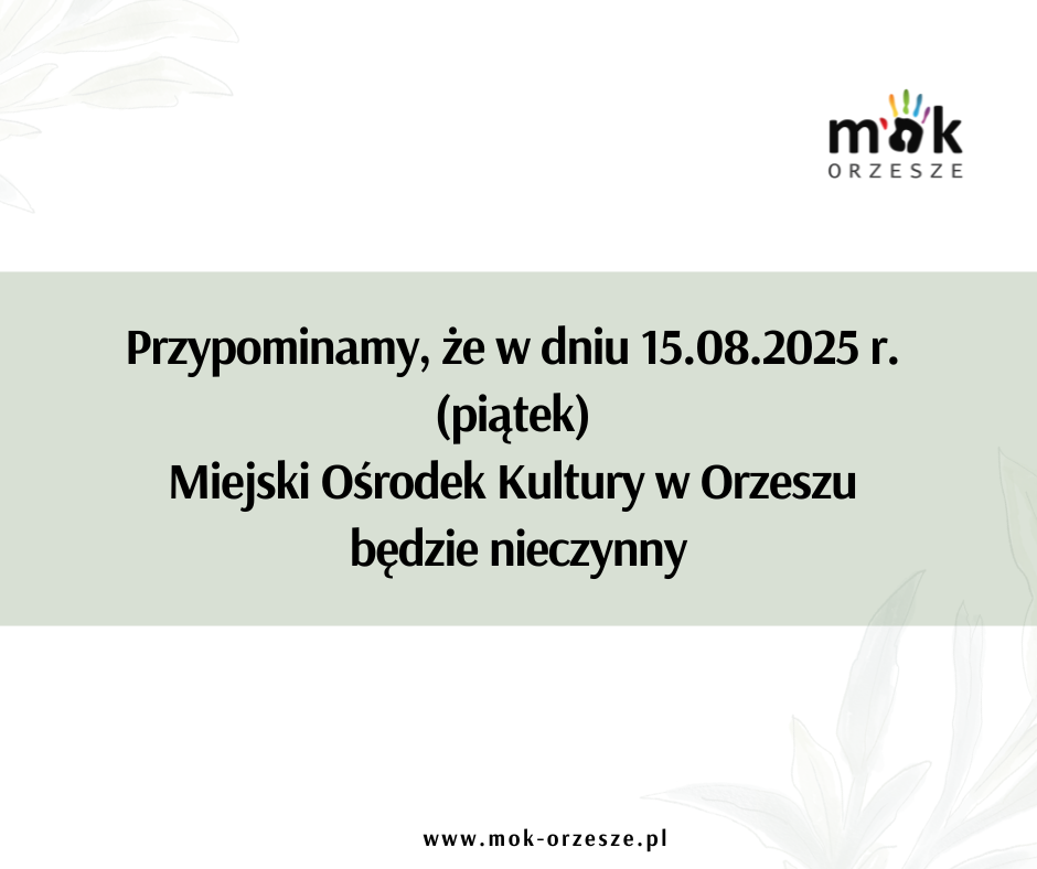 Ważna informacja przez admin · 11 sierpnia 2025 Przypominamy, że w dniu 15.08.2025 r. (piątek) Miejski Ośrodek Kultury w Orzeszu będzie nieczynny!