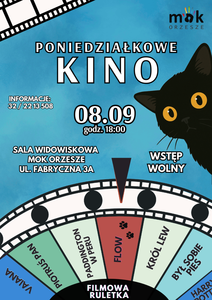 Poniedziałkowe kino przez admin · 18 sierpnia 2025 Po wakacyjnej przerwie powraca Poniedziałkowe kino! 8 września 2025 ️Godz. 18:00 ️Sala Widowiskowa MOK Orzesze, ul. Fabryczna 3A Wstęp wolny Serdecznie zapraszamy! Dodatkowe informacje: 32/ 22 13 508