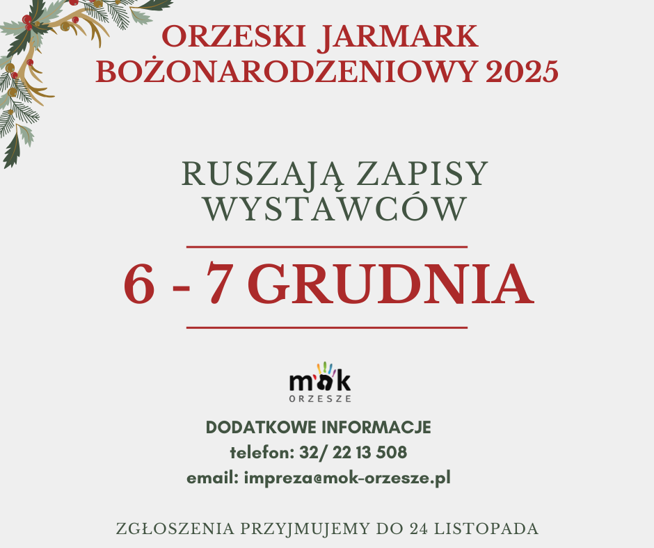 Rozpoczynamy zapisy dla wystawców na tegoroczny Orzeski Jarmark Bożonarodzeniowy, który odbędzie się w dniach 6 – 7 grudnia