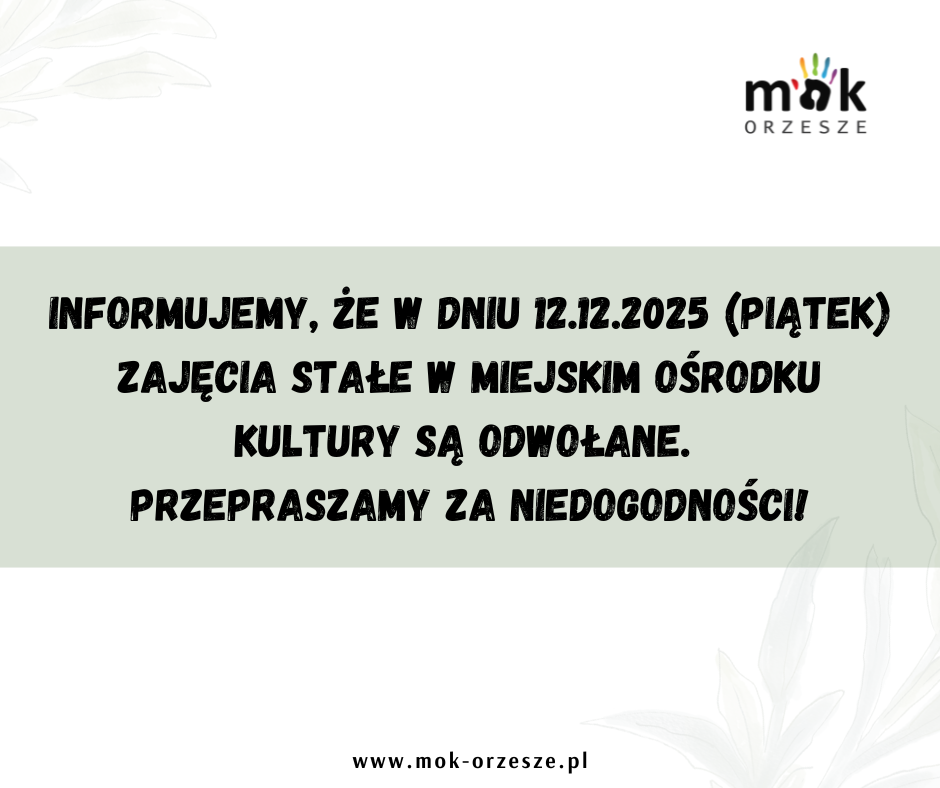 Informujemy, że w dniu 12.12.2025 (piątek) zajęcia stałe w Miejskim Ośrodku Kultury są odwołane.