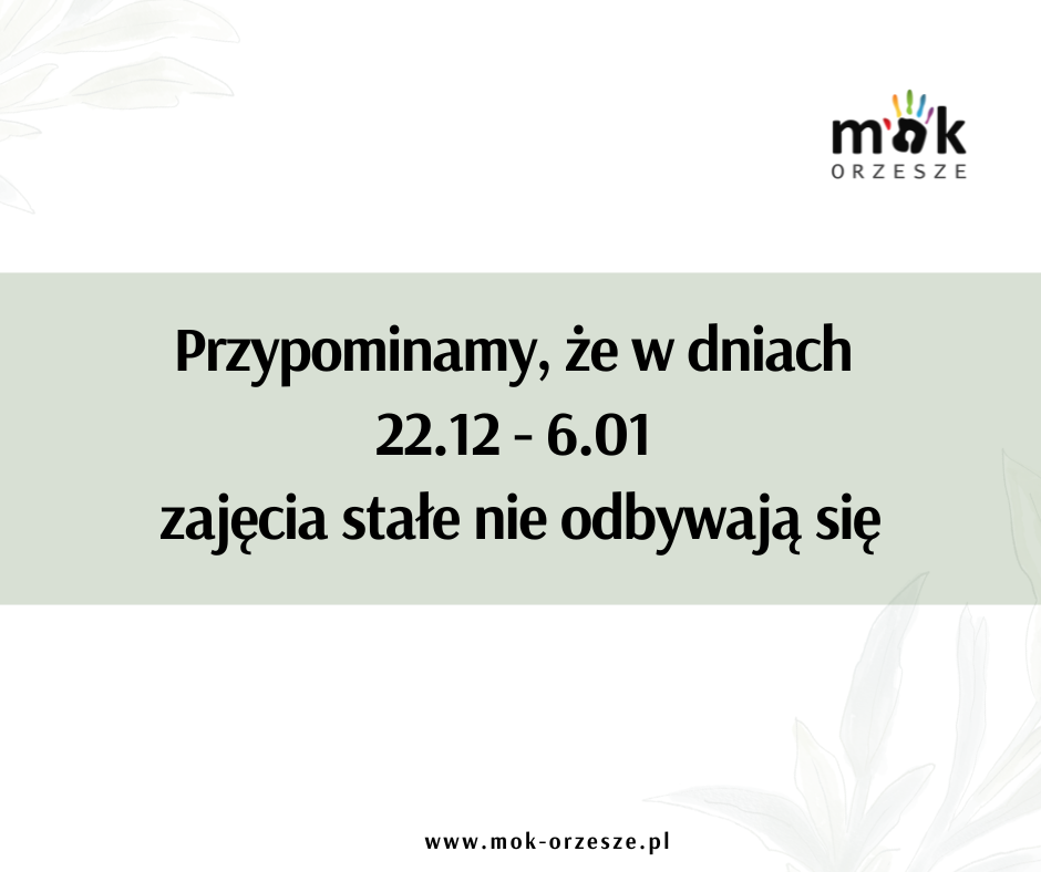 Przypominamy, że w dniach 22.12 – 6.01 zajęcia stałe nie odbywają się z powodu przerwy świątecznej. Biura oraz kasa MOK będą czynne.
