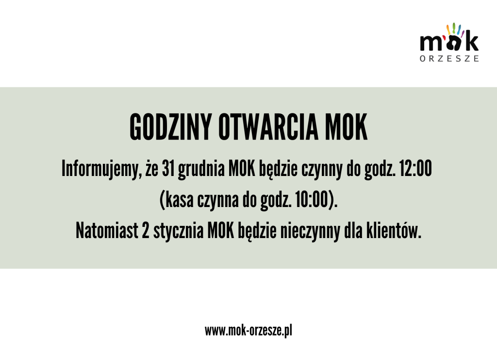 Godziny otwarcia MOK przez admin · 18 grudnia 2025 Szanowni Państwo, informujemy, że 31 grudnia MOK będzie czynny do godz. 12:00 (kasa czynna do godz. 10:00). Natomiast 2 stycznia MOK będzie nieczynny dla klientów.