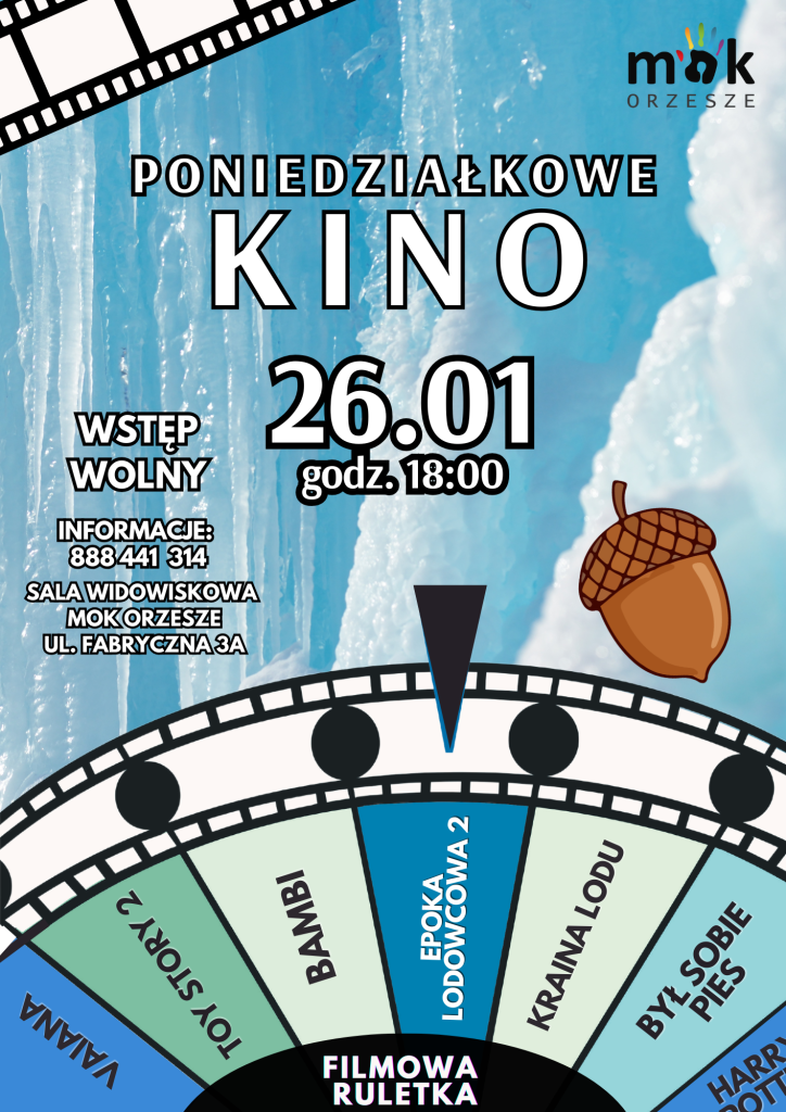 Poniedziałkowe kino w MOK przez admin · 14 stycznia 2026 Zapraszamy Państwa na kolejny wspólny seans 26 stycznia | godz. 18:00 Sala Widowiskowa MOK Orzesze, ul. Fabryczna 3A Wstęp wolny Dodatkowe informacje: 888 441 314 Do zobaczenia!