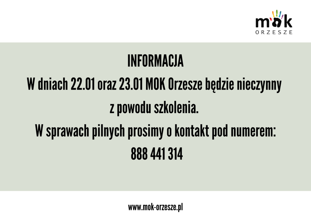 W dniach 22.01 oraz 23.01 MOK Orzesze będzie nieczynny z powodu szkolenia.
