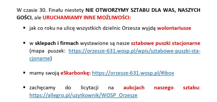 Przekazujemy informację: 30 FinałWielkiej Orkiestry Świątecznej Pomocy zagra 30 stycznia 2022 roku! Przejrzyj na oczy. Dla zapewnienia najwyższych standardów diagnostyki i leczenia wzroku u dzieci. Sztab 631 w Orzeszu-Zawadzie po raz kolejny działa! NASZA...