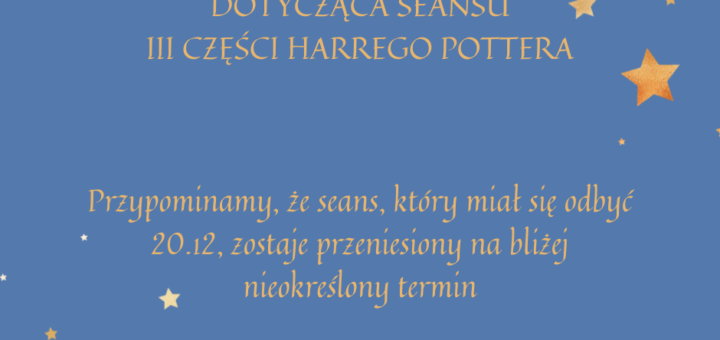 INFORMACJA DOTYCZĄCA SEANSU III CZĘŚCI HARREGO POTTERA Przypominamy, że seans, który miał się odbyć20.12, zostaje przeniesiony na bliżej nieokreślony termin