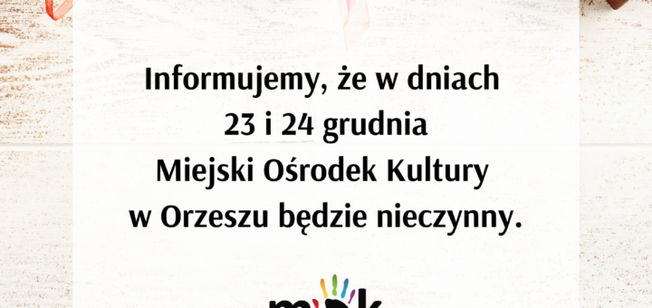 Informujemy, że w dniach 23 i 24 Miejski Ośrodek Kultury w Orzeszu będzie nieczynny. Życzymy zadumy nad płomieniem świecy, filiżanki dobrej, pachnącej herbaty w doborowym towarzystwie, pięknej muzyki, słuchanej wieczorem, śmiechu, ciepła rodzinnego i...