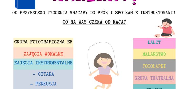 WRACAMY! OD PRZYSZŁEGO TYGODNIA WRACAMY DO PRÓB I SPOTKAŃ Z INSTRUKTORAMI! CO NA WAS CZEKA OD MAJA? GRUPA FOTOGRAFICZNA EF ZAJĘCIA WOKALNE ZAJĘCIA INSTRUMENTALNE – GITARA – PERKUSJA – PIANINO BALET MALARSTWO FOTOŁAPKI GRUPA...
