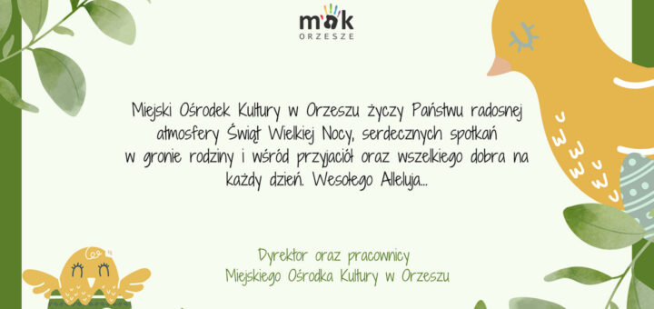 Miejski Ośrodek Kultury w Orzeszu życzy Państwu radosnej atmosfery Świąt Wielkiej Nocy, serdecznych spotkań w gronie rodziny i wśród przyjaciół oraz wszelkiego dobra na każdy dzień. Wesołego Alleluja Dyrektor oraz pracownicy MOK Orzesze