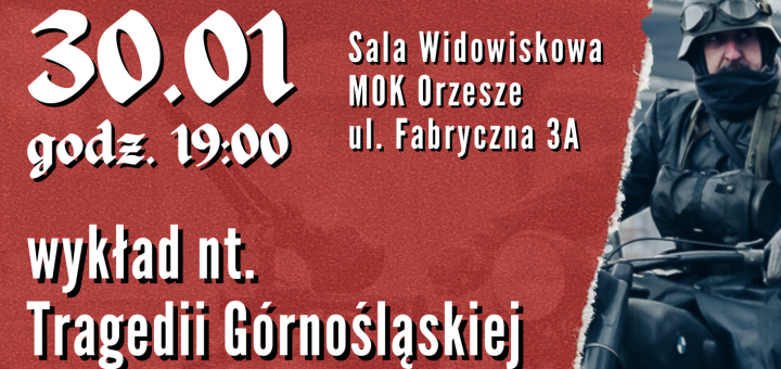 W ramach wydarzenia „Górny Śląsk w ogniu. Orzesze, styczeń 1945” zapraszamy na wykład prof. dr. hab. Ryszarda Kaczmarka na temat Tragedii Górnośląskiej 30 stycznia | godz. 19:00 Sala Widowiskowa MOK Orzesze, ul. Fabryczna 3A...