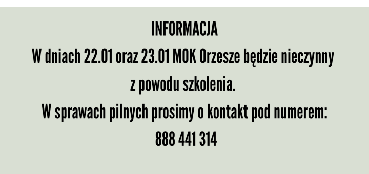 INFORMACJA 📣W dniach 22.01 oraz 23.01 MOK Orzesze będzie nieczynny z powodu szkolenia.W sprawach pilnych prosimy o kontakt pod numerem: 888 441 314 Przepraszamy za niedogodności!